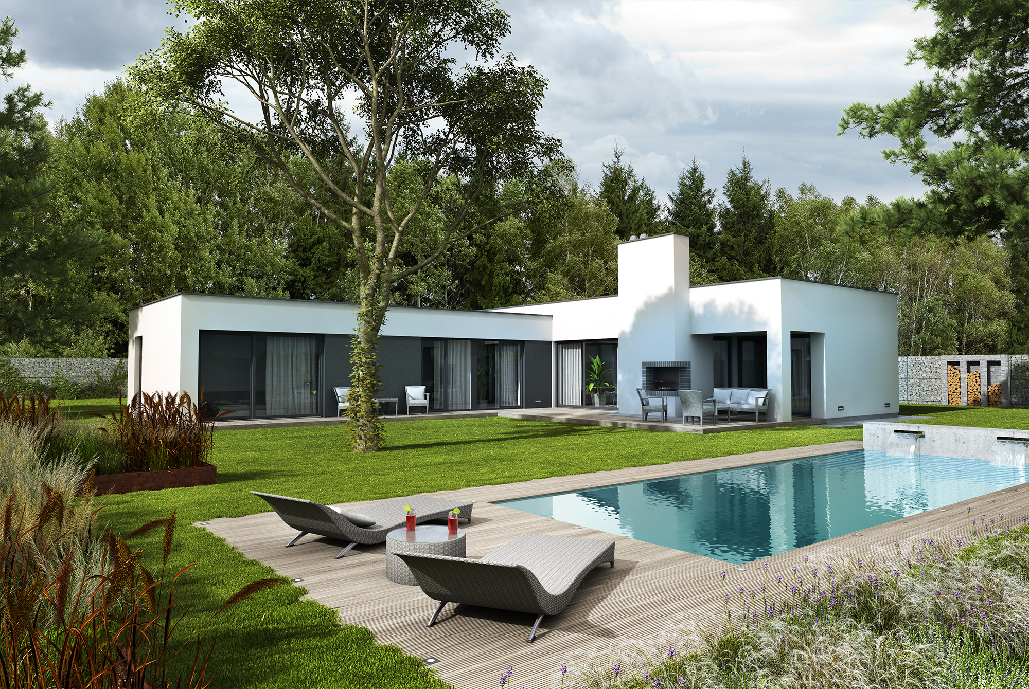 Dominantou domu je prostorný obývací pokoj s krbem, který navodí útulnou atmosféru v chladných dnech a současně ušetří náklady na energie. K dispozici budou dvě koupelny, dvě zastřešená parkovací stání a promyšlená dispozice, která poskytne dostatek prostoru celé rodině.